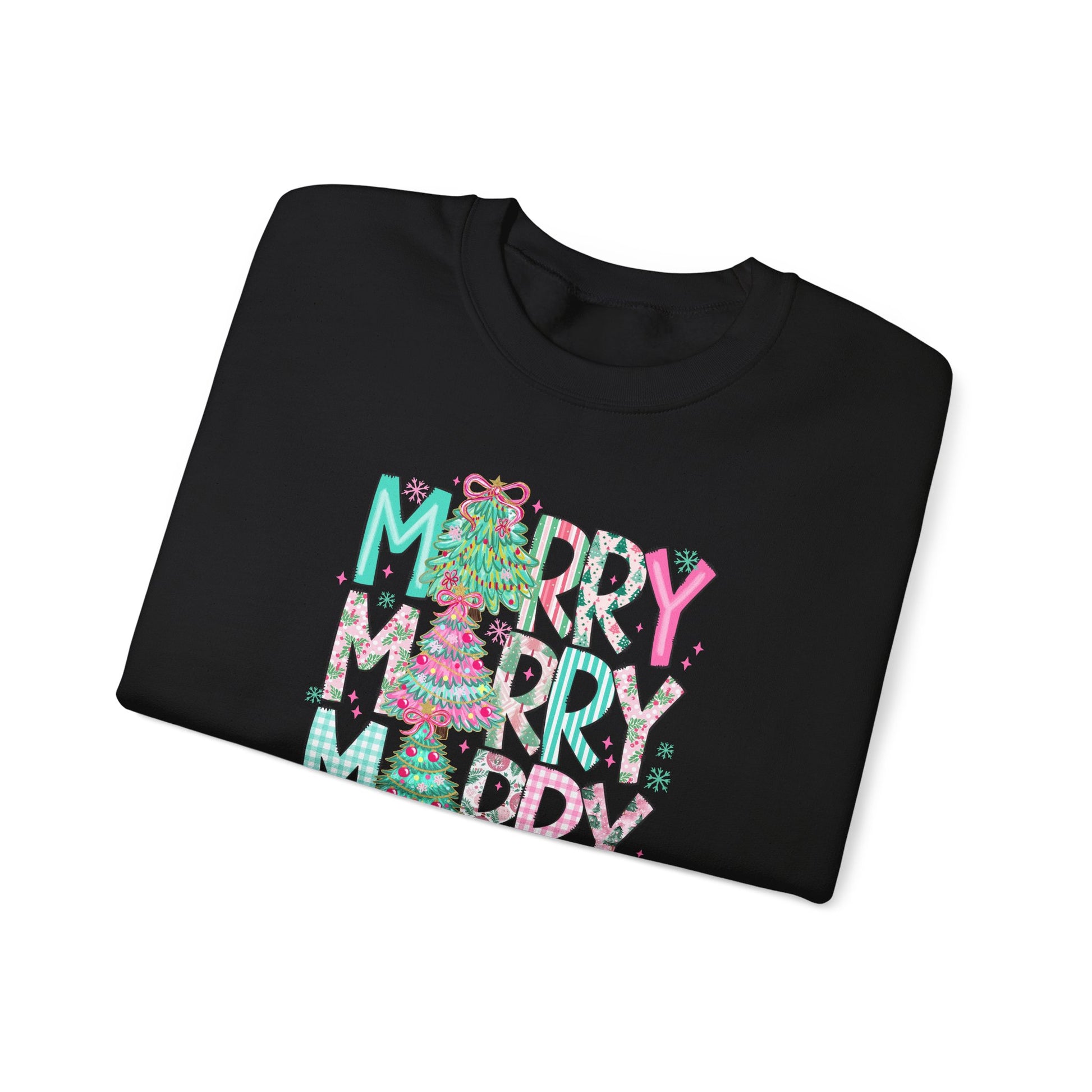 If one "Merry" isn't enough, we've got you covered! This bold and bright crewneck is absolutely packed with cheer. Our unique design features three plaid Christmas trees set between the repeated phrase "MERRY MERRY MERRY Christmas" in vibrant hot pink, teal, and aqua colors. It’s a modern, fun twist on classic holiday wear!