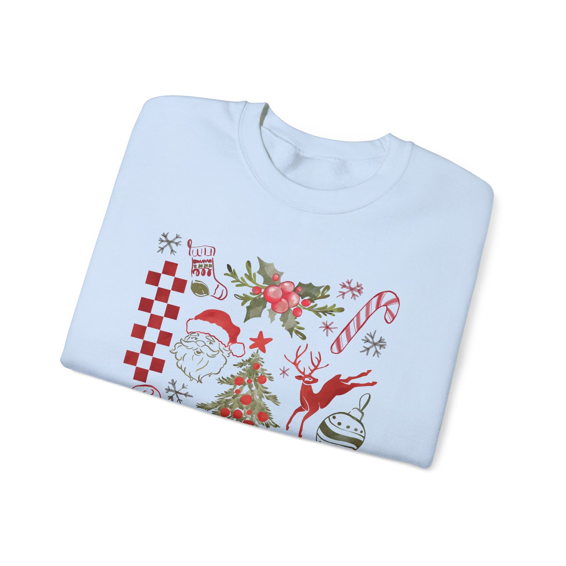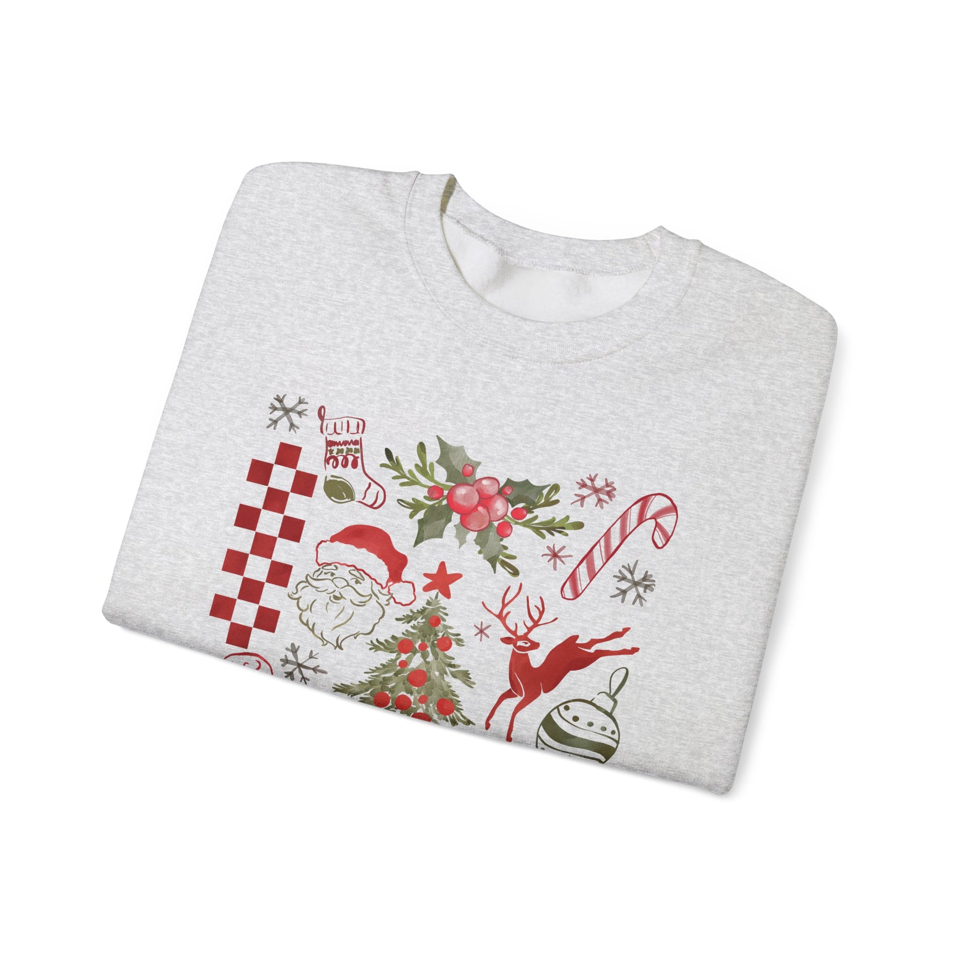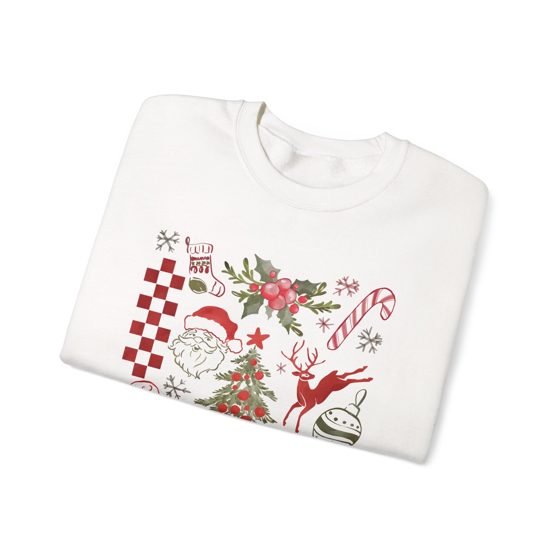 This charming holiday crewneck features a delightful Christmas sampler collage with all the classics: a festive Santa Claus, gingerbread man, candy cane, and a cute reindeer. The unique checkerboard accents add a touch of fun to this festive graphic.