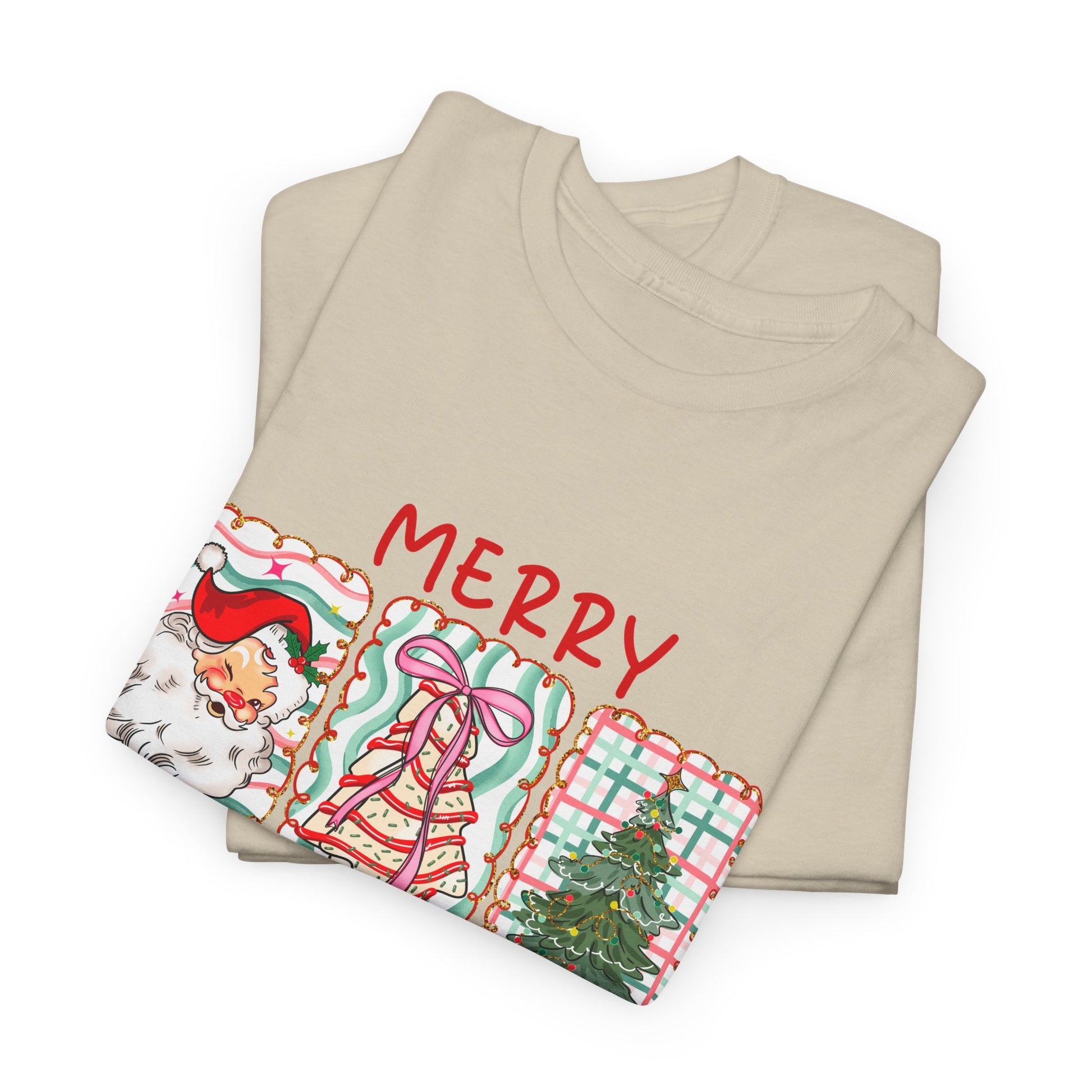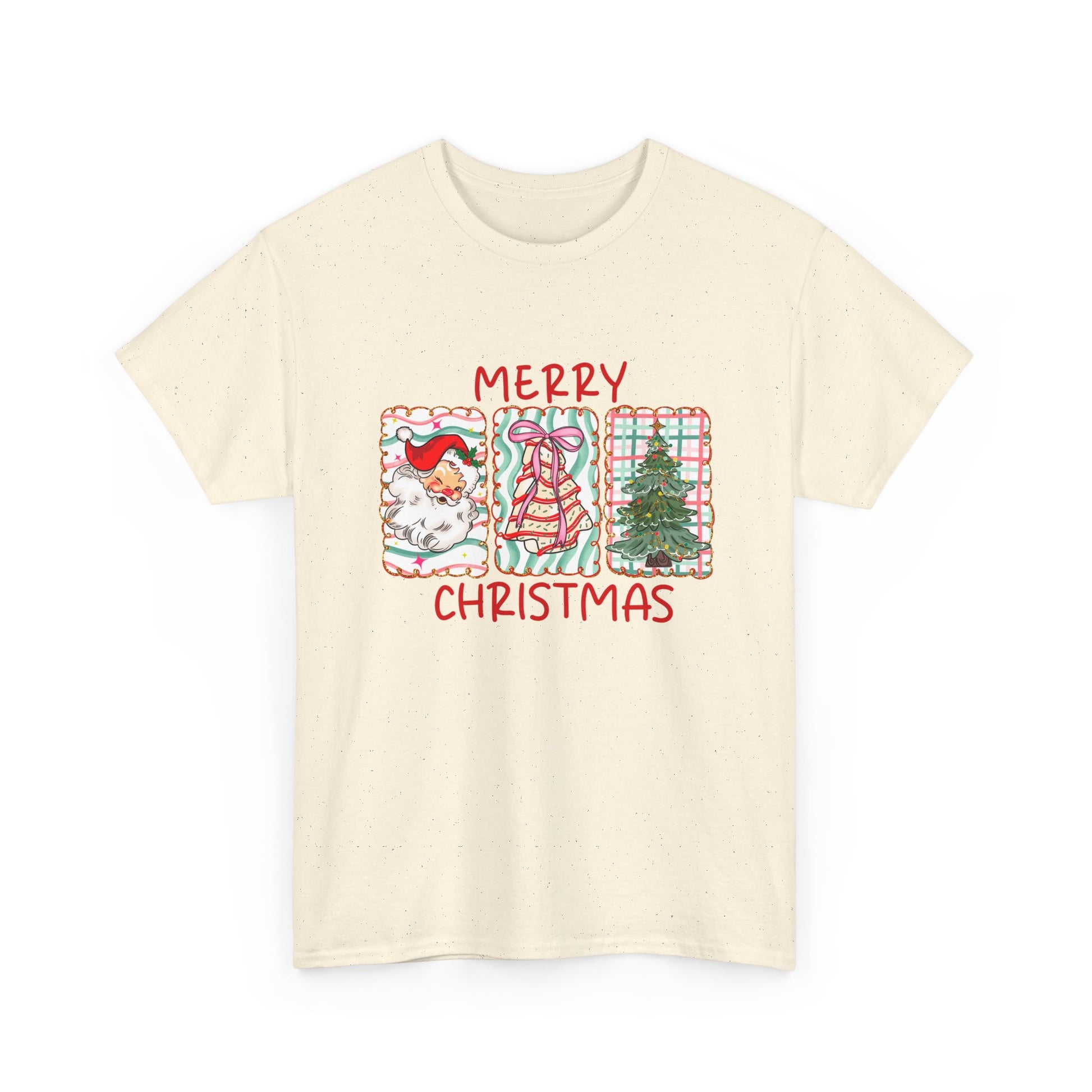 This charming "MERRY CHRISTMAS" T-shirt features a beautiful three-panel grid design, perfect for any cozy holiday gathering. Each square is filled with festive charm: