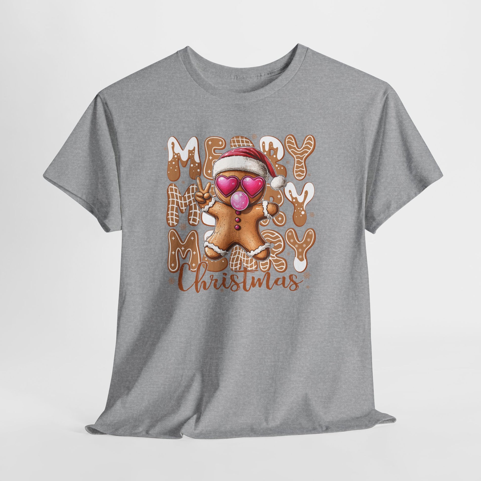 This adorable Gingerbread Man T-Shirt is pure Christmas cozy, with a sprinkle of sass. Our little cookie friend is rocking a Santa hat and heart-shaped sunglasses, nestled among the "MERRY" text designed to look like delicious sugar cookies.